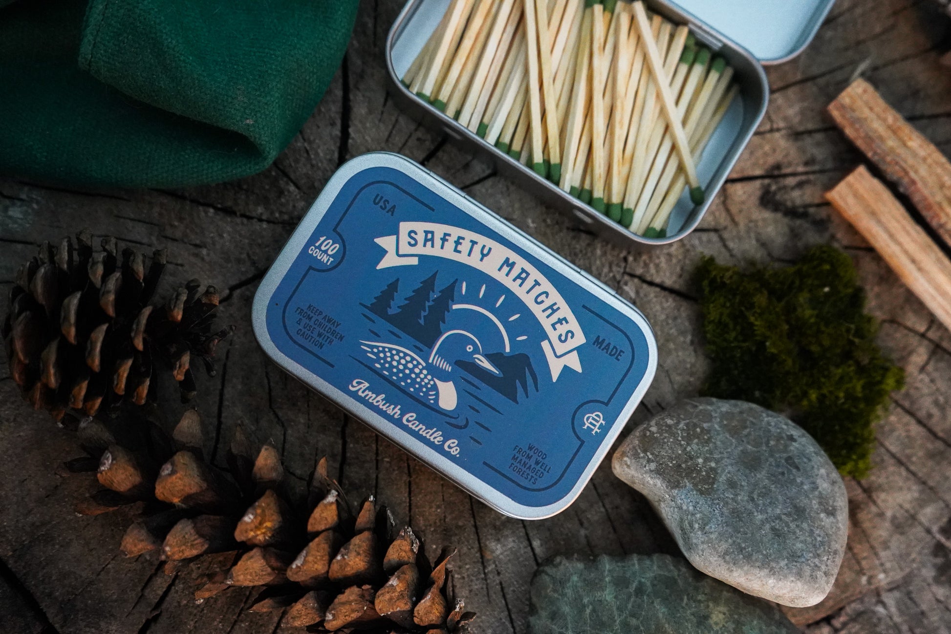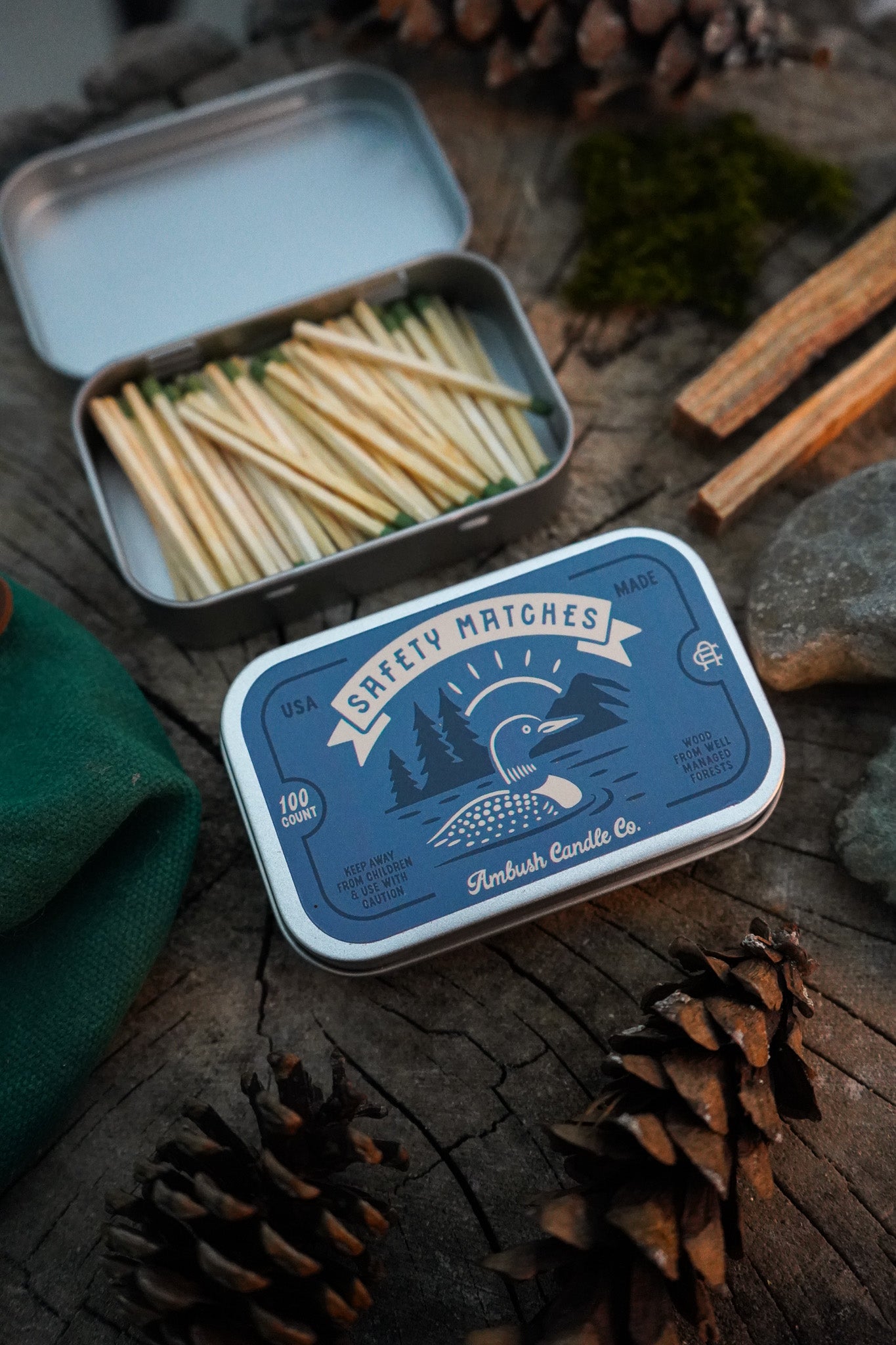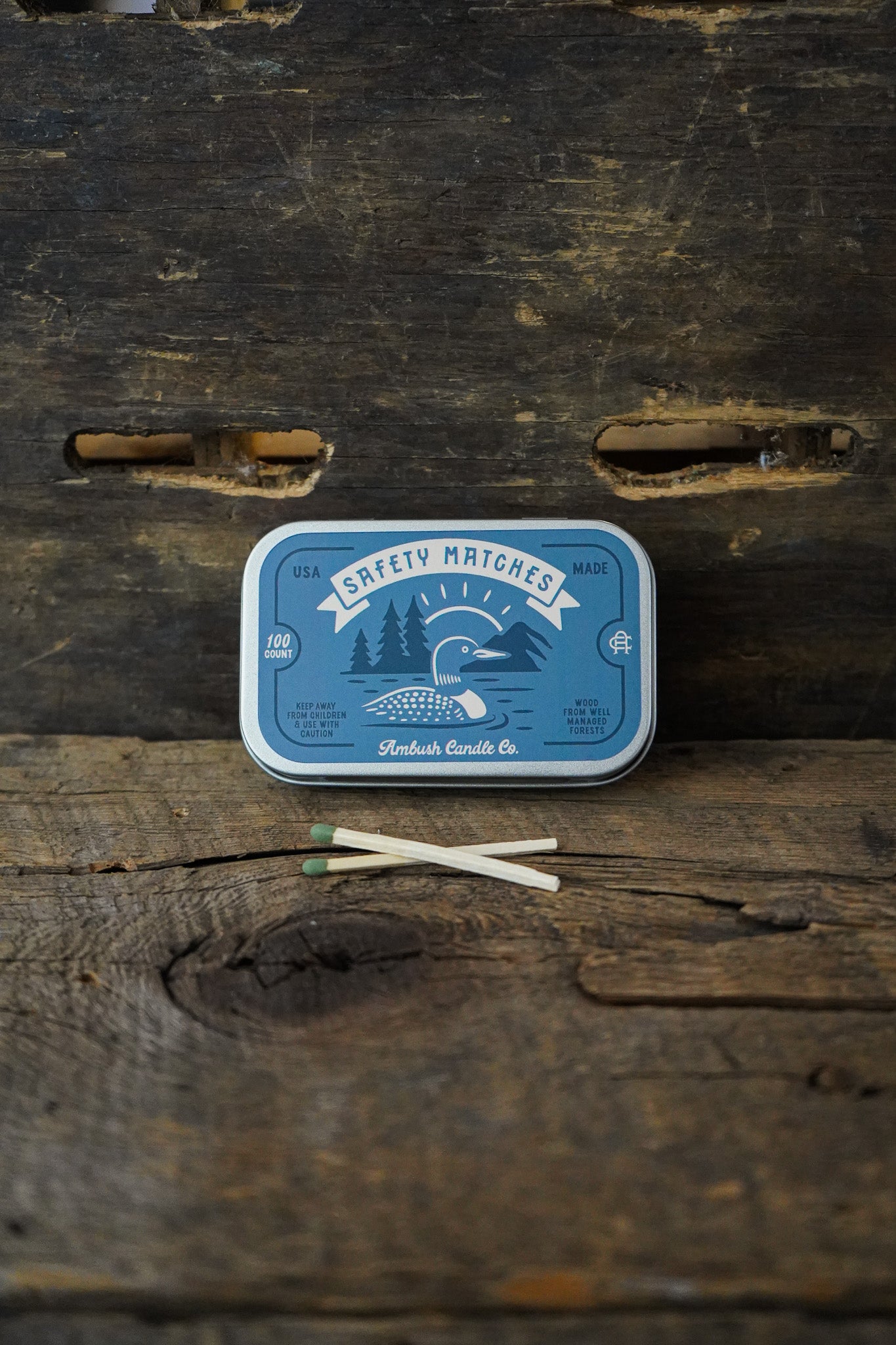 Each tin contains 100 safety matches with a strike surface on the bottom for dependable lighting. The match sticks are made from sustainably sourced wood and crafted in the USA using American-made components, because even the simplest tools should be well made.