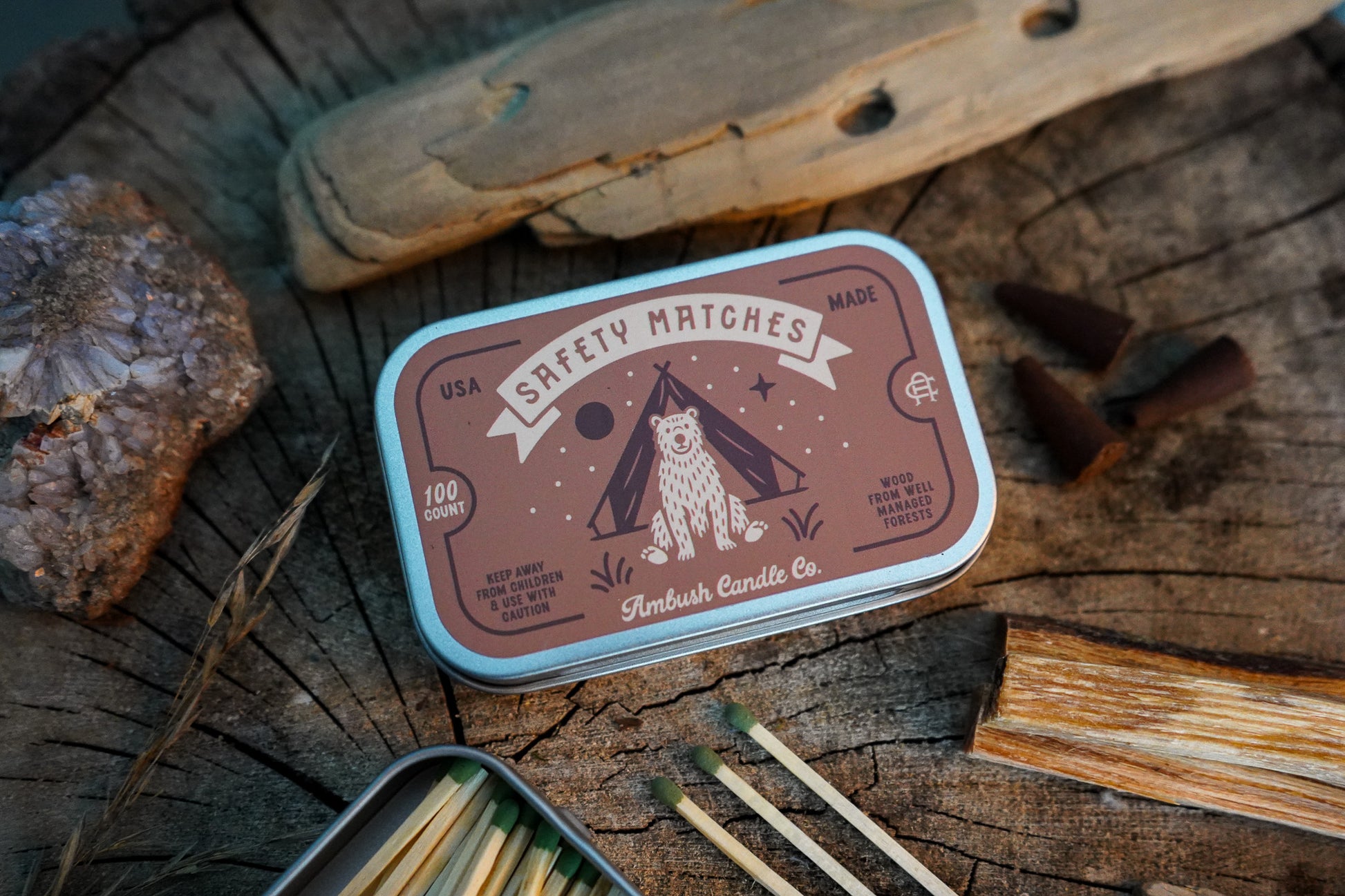 Each tin contains 100 safety matches with a strike surface on the bottom for dependable lighting. The match sticks are made from sustainably sourced wood and crafted in the USA using American-made components, because even the simplest tools should be well made.